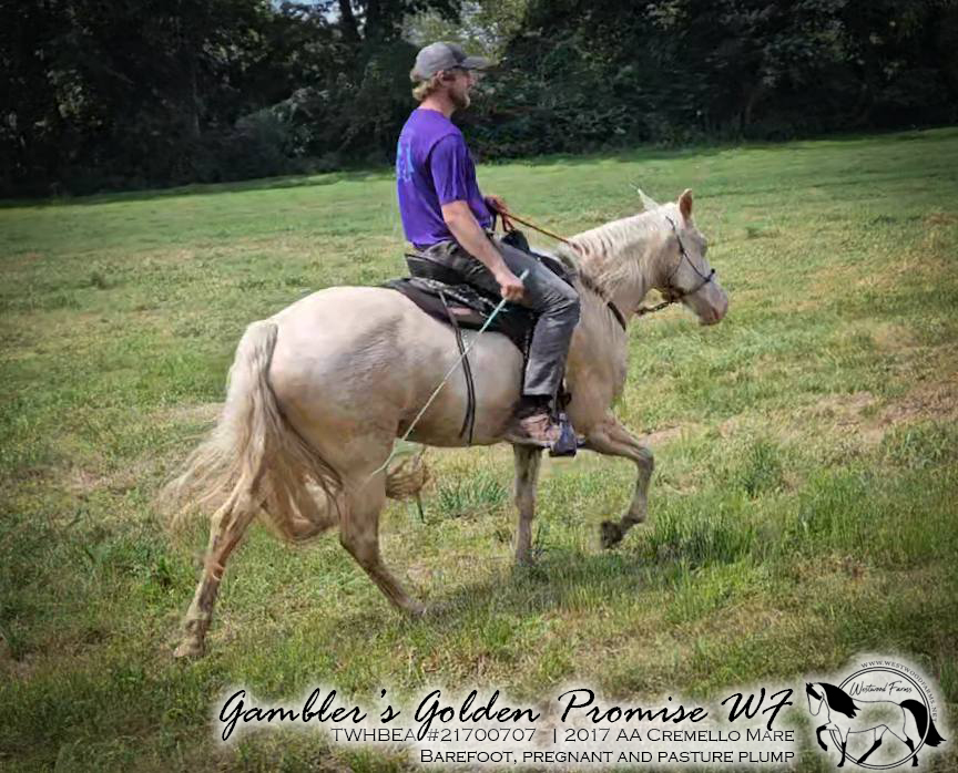 Pippi White Stockings, aka "Kate" is a mixture of solid early modern lines through her sire, the massive Gen's Armed & Golden T.F. He is a palomino directly by the great Gen's Armed and Dangerous (by Pride's Generator and out of an Ebony Masterpiece daughter.) Armed and Golden gets his color from his dam, who goes back to the unusually but sought after Rock and Roll Mason, son of Wilson Strollin Gold. Kate's dam, Porcelain Rose, was a cremello mare who stood 14.3h, but should have been much larger. She was stunted by a difficult life according to Jim Holmes. Her two color lines come through Chance's Goldust H., the massive palomino stallion by John A's Chance. John A's Chance is considered by some to be the greatest palomino breeding stallion in history. His offspring were consistent competitors at the National Celebration. John A's Chance sired horses with plenty of natural action. He was by Last Chance (by Hunter's Allen and out of the great mare, Merry Legs) and out of Goldust Maid (by Hall Allen and out of Hendrixon Bonnie, a buckskin mare by Roan Allen.) Porcelain Rose was out of White Champaign, a cremello mare by Bud England. Ruth's sire is Golden Gambler, one of the best horses I've ever had the pleasure to ride. Gambler's bloodlines are a unique blend of the western working bloodlines through his sire, Blue Gold (who goes back to Roy Roger's own "Trigger Jr." aka Allen's Gold Zephyr), and the old eastern show lines through his dam, Cindy's Image-GH. Image was known for her true walking horse gaits and lovely disposition. Her sire was by Ebony Masterpiece and dam by Triple Threat. I chose Gambler's Golden Promise for her registered name for two reasons. Her genetic makeup - two cream genes and two agouti genes, means that when bred to a normal colored stud (bay, black or chestnut) she will ALWAYS throw a gold (palomino or buckskin) foal. As Gambler is getting up in age, this filly represents promise for the future. She will help us further our goal of producing golden walking horses that truly represent the foundation of the walking horse breed. Ruth was started under saddle in 2021 and showed tremendous ability. We are THRILLED with her. She has joined our riding and breeding herd. She foaled a buckskin filly by The Armed Bandit on 6/26/2022. We had just returned from the 2022 4 Beats for Pleasure June Jubilee in North Carolina Ruth looked at us as if to say "oh thank goodness you're home!" and laid down to give birth. Jarred and I stood by her side and helped her deliver her first foal. It was such a beautiful moment. Her sire and dam were in adjoining paddocks nickering to her and the filly. Ruth, true to form, ate hay as she rested afterwards. Her daughter decided what was good for Mom, was good for her and attempted to nurse while both were still laying down.
