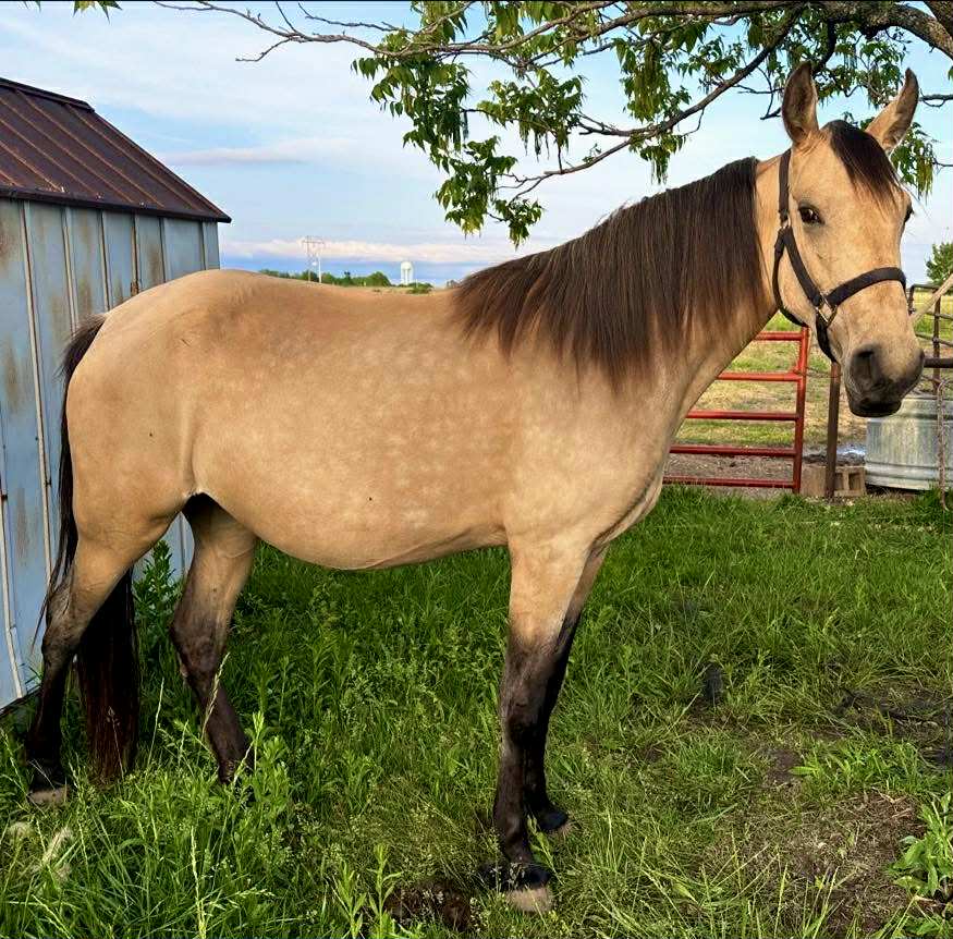 My Lovely Lady May TCG (Tuesday) is by the popular 16.2h AA cremello stallion, DMF's John Wayne. He is a popular field trial sire who has produced many big, golden horses. Tuesday's dam is Mystery Lady Blue Magic, a blue roan granddaughter of Evil's Stuntman.