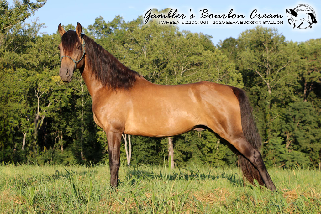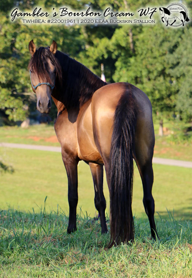 Bourbon's dam, Shake 'Em Up, Sophie comes from our good friend, Gwen Moberly, of Flying Horse Ranch in Kentucky. Gwen knew we were looking for large, big boned, natural gaited mares with older bloodlines, so she reached out to us about Sophie. Sophie was exactly what we were looking for. Her bone substance was superb. She was built like the old-style walking horse. She had a big, well sloped shoulder with great withers (actually, it reminded me of Gambler's dam, Image.) Her back was of moderate length. The slope of her hip and depth of her loin are what we loved to see. She was also set well underneath herself behind with just the right amount of angle to her back legs. Sophie got her tremendous size, bone and stoic disposition honest. She carried the blood of Midnight Sun, Shaker's Shocker, Mack K's Handshaker, Midnight Mack K and Ebony Masterpiece as well as the lesser known but equally great Black Dust MR, and Eb's Frankley Mr Shankley. She was certified with the International Heritage Horse Association as 100% Heritage. Sophie had never been broke to ride, but she has such a sweet, accepting disposition that at 19 years of age, Jarred decided to see how she would react to the possibility of carrying a rider. We tacked her up and she stood quietly, watching us with soft eyes. Jarred led her around with the saddle and she couldn't have cared less. So I held her while Jarred climbed aboard. Sophie didn't move. She turned her nose towards his foot as if to say "what are you doing up there?" Jarred urged her forward, but she didn't know quite what to expect. I took the lead rope and walked her around the ring less than a full lap when Jarred said "let her go." I did. And she walked. I stood in the middle of the ring and kissed to her to ask her to go. Jarred improvised and made some funny noises to encourage her on from time to time and bless her sweet, patient heart, she gamely tried everything that we asked of her. She did not take a step out of line. This is EXACTLY the kind of naturally willing, good minded disposition that we try so hard to breed for. What you see here is no training, no muscle development, no experience whatsoever...just Sophie. On the top side of his pedigree, Bourbon is the product of three of our most beloved horses (Golden Gambler, Pippi White Stockings, and The Tennessee Stud WF ) Her sire, The Tennessee Stud WF (G2), was carefully bred and raised here at Westwood Farms. "G2" is exactly what we've been breeding for. He has a wonderful disposition: kind, friendly and respectful. From birth, he demonstrated a keen intelligence and strong desire to please that I love so much about his sire. He also has the larger bone structure that I love about his dam. G2 has a true running walk with a great backend. He will walk and shake at both the flatwalk and running walk or you can tighten him up and do a smooth, sailing saddle gait with considerable speed. He does these gaits naturally and has never even worn a shoe at this point. He also has a beautiful canter. He truly represents the versatility that the original walking horse was bred for. He would be competitive in shows and still be a comfortable, smooth and sane mount for trails or field trials. G2's sire is Golden Gambler, one of the best horses I've ever had the pleasure to ride. Gambler's bloodlines are a unique blend of the western working bloodlines through his sire, Blue Gold (who goes back to Roy Roger's own "Trigger Jr." aka Allen's Gold Zephyr), and the old eastern show lines through his dam, Cindy's Image-GH. Image was known for her true walking horse gaits and lovely disposition. Her sire was by Ebony Masterpiece and dam by Triple Threat. G2's dam, Pippi White Stockings is one of the best palomino mares I've ever found. I searched the whole country hoping to find the perfect mare to breed to Gambler and try for a colt to eventually replace him. Golden Gambler was getting older (and while I sincerely hope to have many more years of riding and memories) and the thought of not having a replacement was really starting to concern me. I put out feelers and scoured the web looking for a mare. Not just any mare, mind you...I wanted a dark palomino or buckskin; at least one agouti; 100% smooth, natural gaits; 16+h; STELLAR disposition; intelligent; willing; good bone and muscle...no short order, but that was what I needed. I scoured the country for five years before Lacey Musselman called to let me know that her friends, Rick & Lindsey Payette, were getting ready to move to South America and wouldn't be able to take along their amazing mare, Pippi White Stockings aka "Kate." I immediately called and set up an appointment to go see her. It was love at first ride and I bought her the same day. It was absolutely love at first ride. Kate's easy, effortless running walk was just perfect. She strolls like a walking horse should. No shoes...no rider effort...just natural. She has a to-die-for true running walk with a headshake that comes from reach, not gimmicks. She is a lady in the truest sense of the word. She has polite, genteel manners. She is never pushy or rude. Her demeanor is just perfection: pleasant, content and calm. She is a professional when it comes to riding. Even with foals in tow and chaos around her, she stays focused on her rider. She is out of a great minded, swingy gaited, enormous palomino son of Gen's Armed and Dangerous, Gen's Armed & Golden TF, whose color lines comes from the rare but excellent quality Wilson Strollin Gold. Kate's dam, Porcelain Rose was a square gaited cremello mare from the lines of Chance's Goldust H and the great John A's Chance.